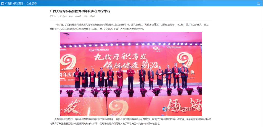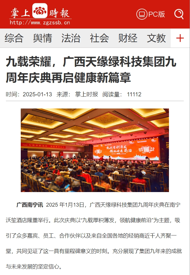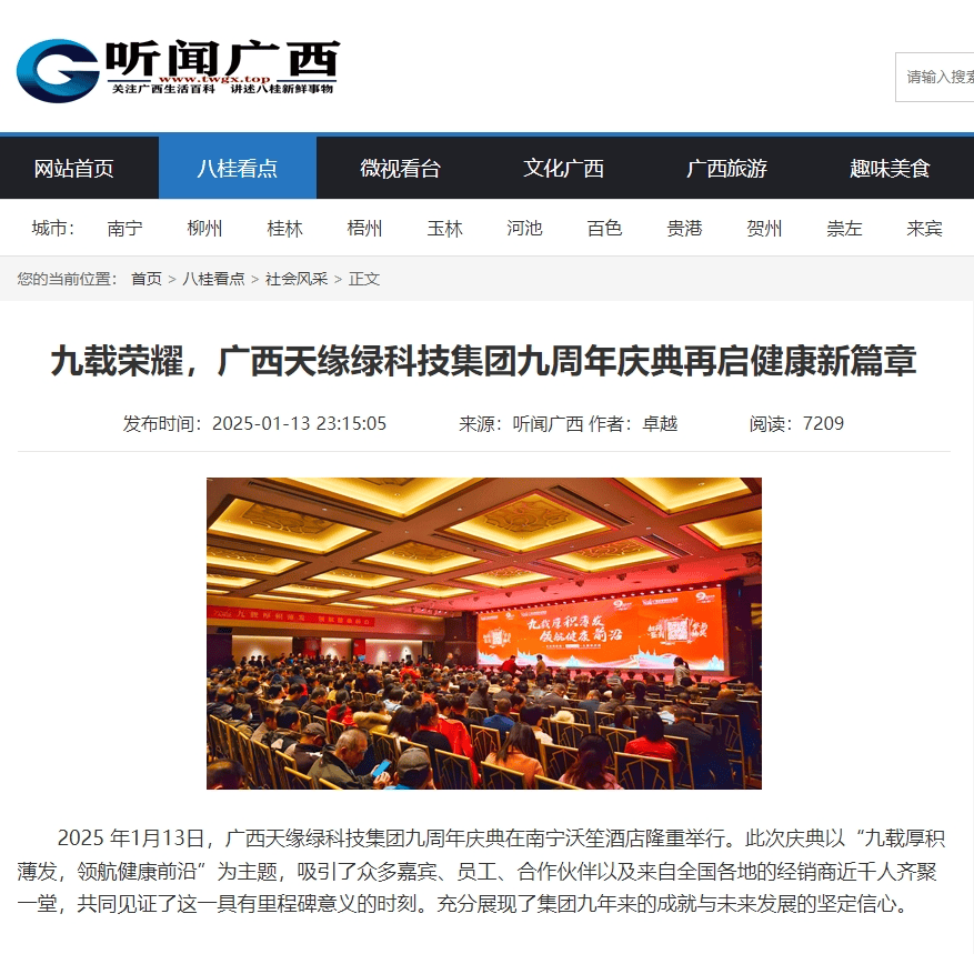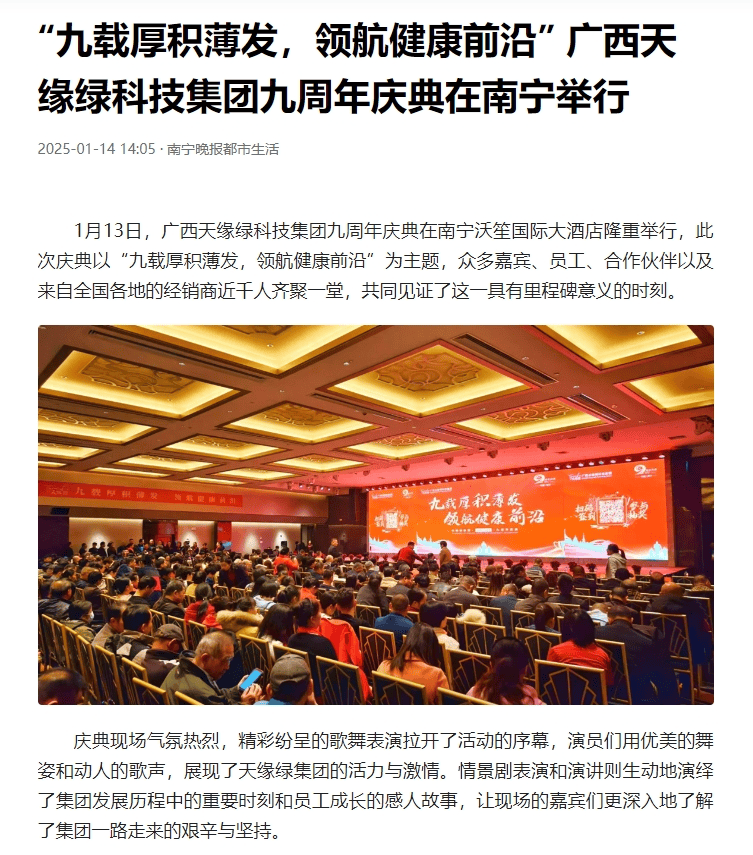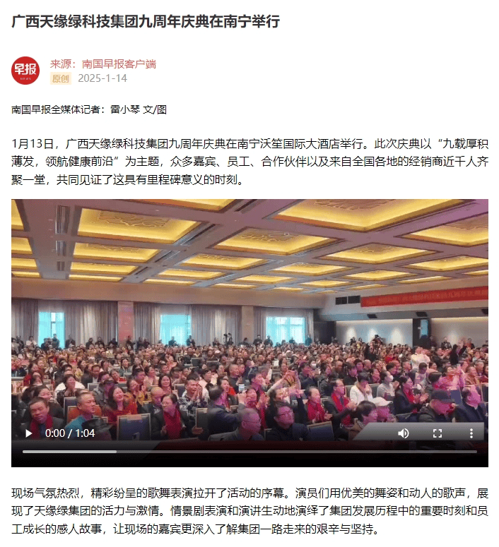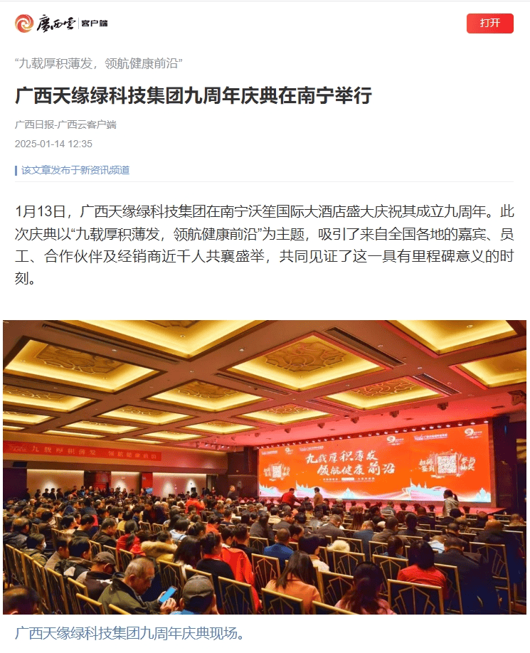 慶典盛況空前,南國(guó)早報(bào)、聽聞廣西、東盟新聞周刊、中國(guó)報(bào)道、東盟頭條、掌上時(shí)報(bào)、廣西縣域經(jīng)濟(jì)網(wǎng)等三十多家新聞媒體紛紛聚焦此次慶典,競(jìng)相報(bào)道這一健康產(chǎn)業(yè)的盛事。媒體記者們用鏡頭捕捉每一個(gè)精彩瞬間,用筆觸記錄每一份感動(dòng)與榮耀,將天緣綠集團(tuán)九周年的輝煌與夢(mèng)想傳遞給千家萬戶。